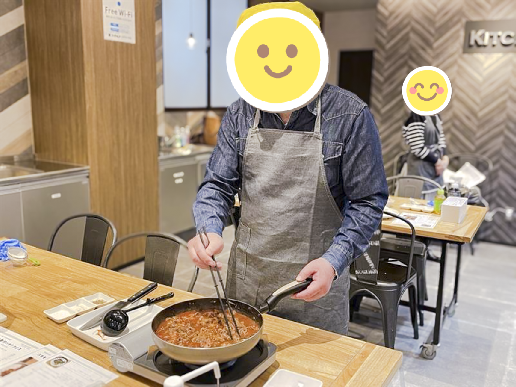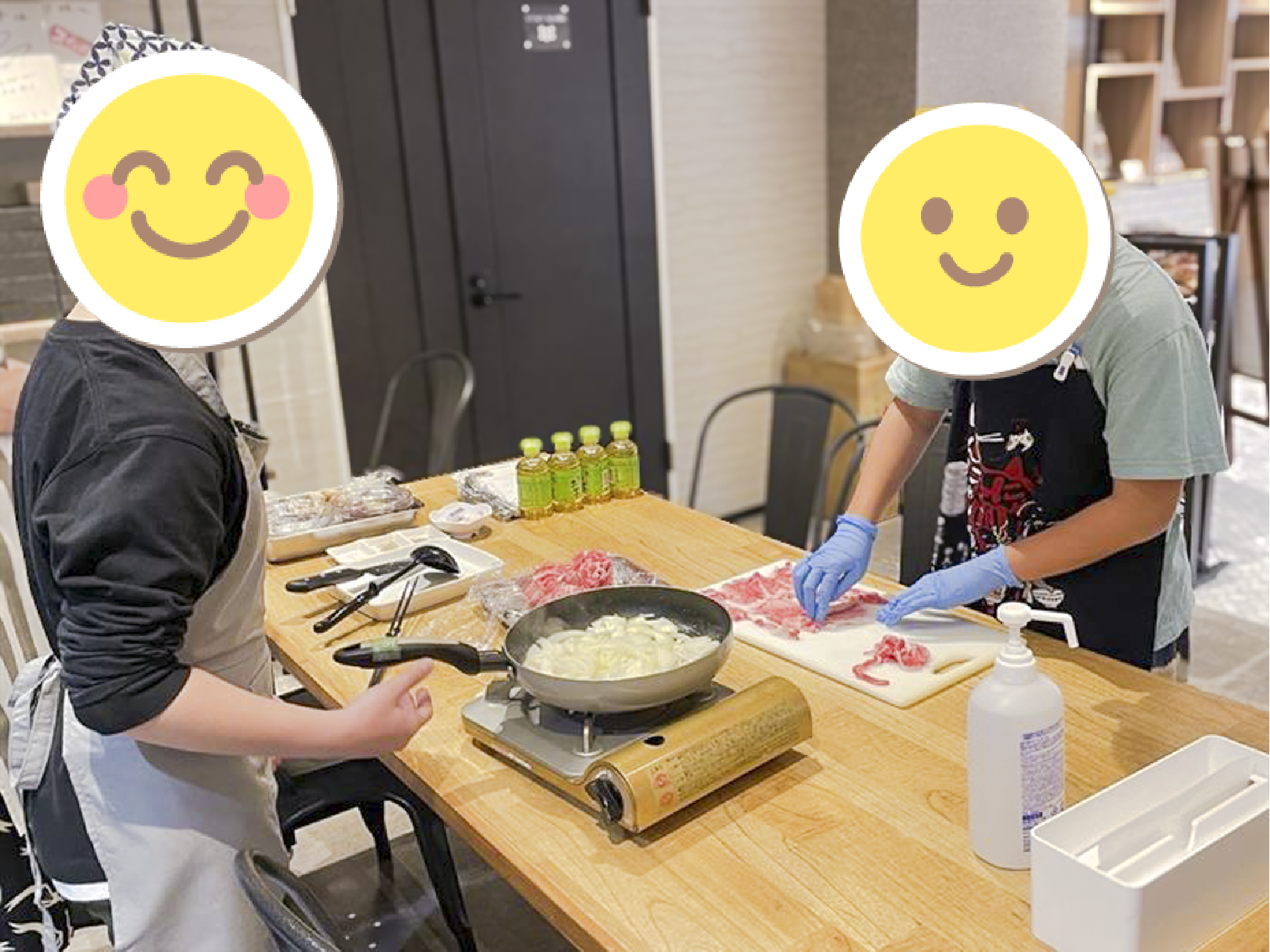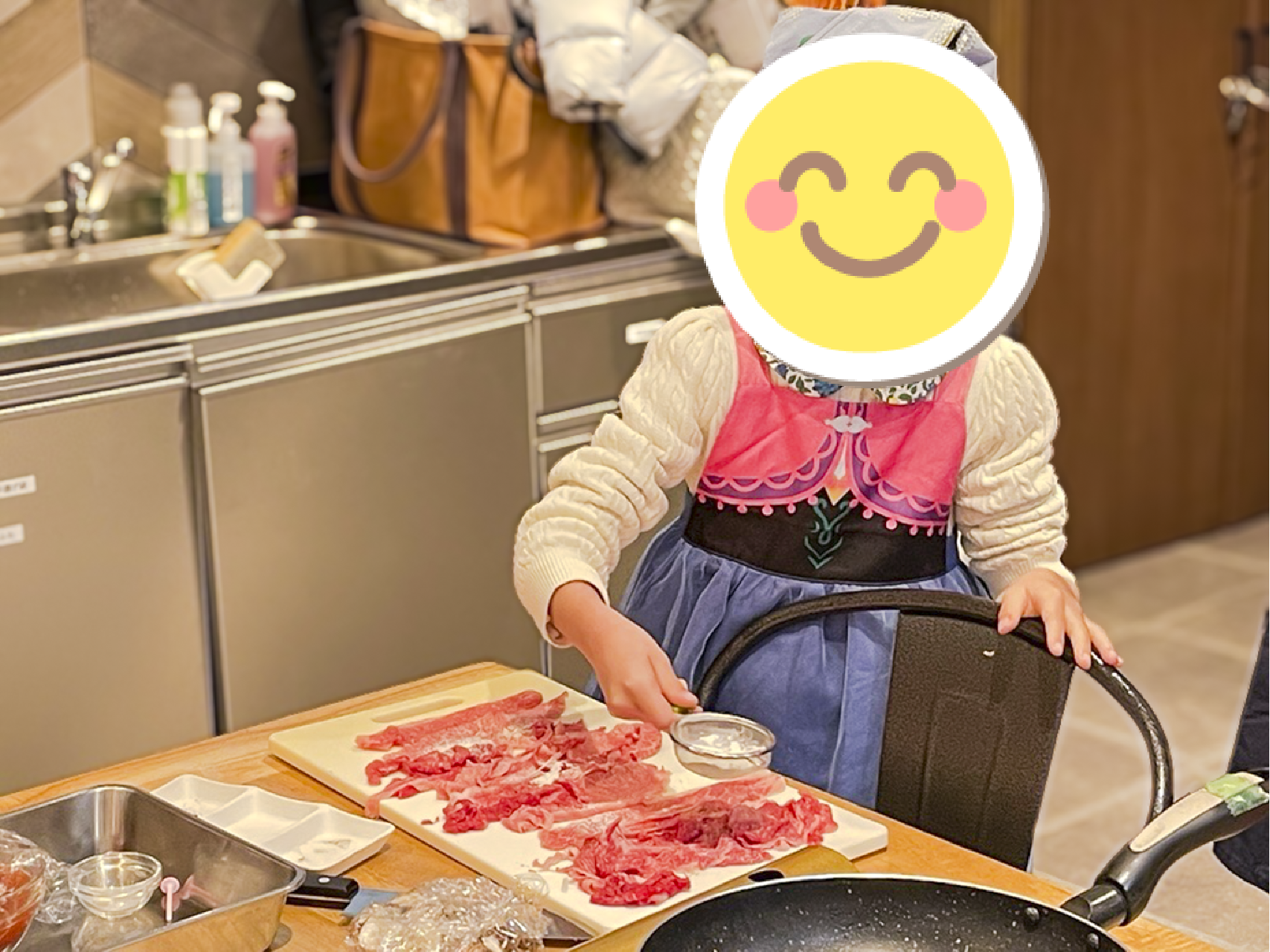 料理教室では、お肉を広げて小麦粉をふる工程で、