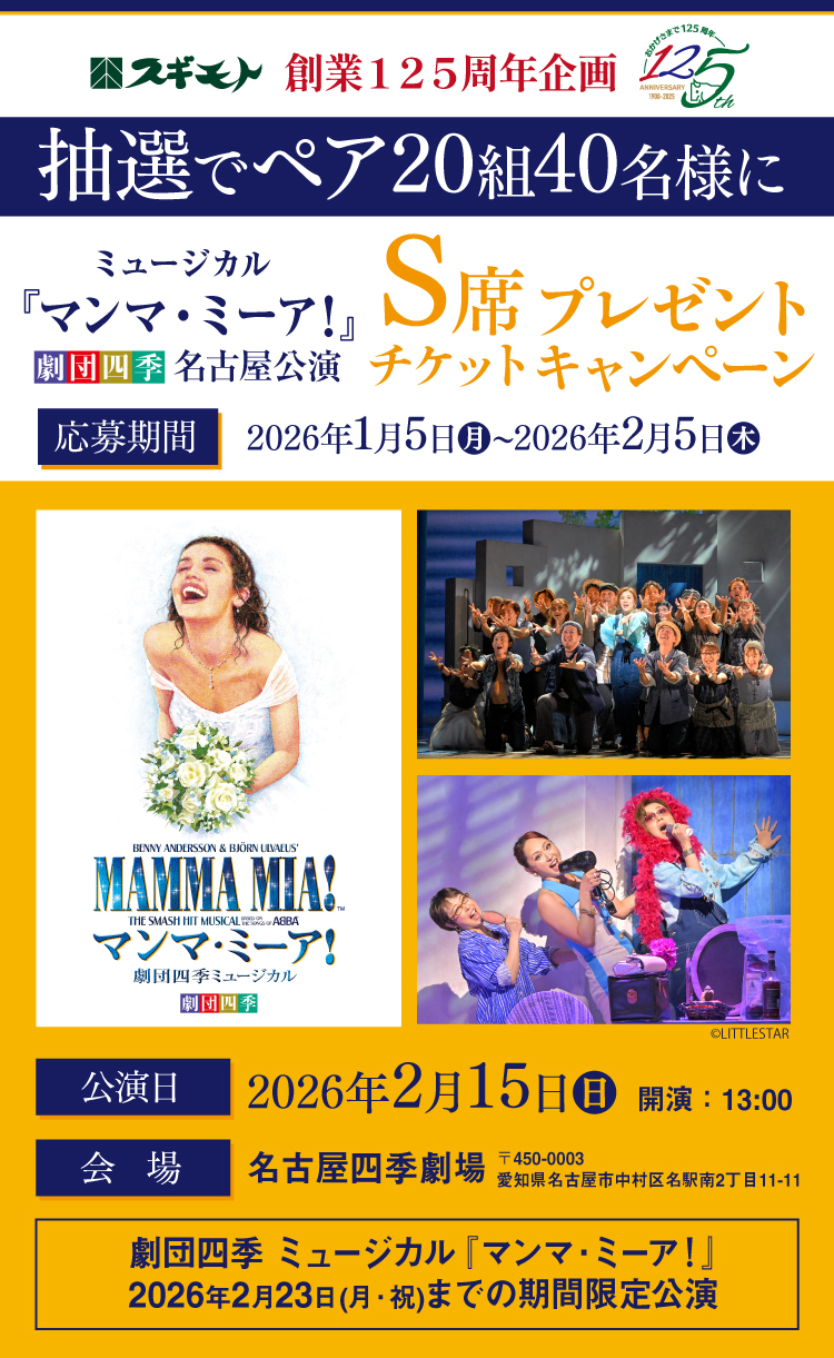 皆様のご愛顧に感謝し、「劇団四季ミュージカル『マンマ・ミーア!』名古屋公演S席ペアチケットプレゼントキャンペーン」を開催します!