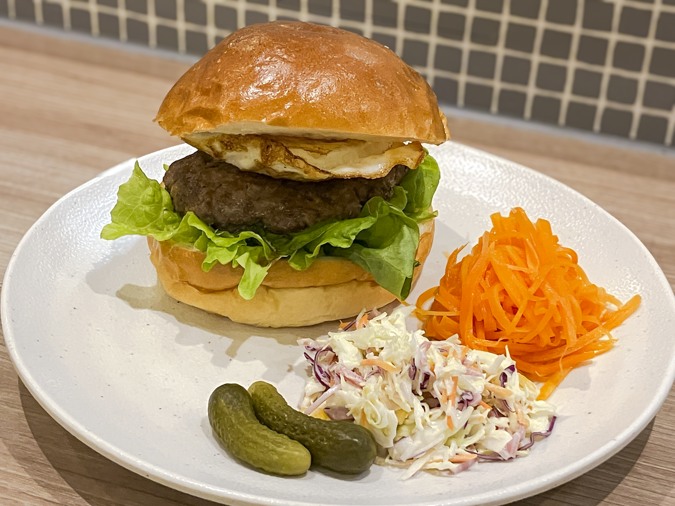黒毛和牛と黒豚を使用した、スギモト本店だけの特別な手ごね生ハンバーグを平たく成形しパティに。